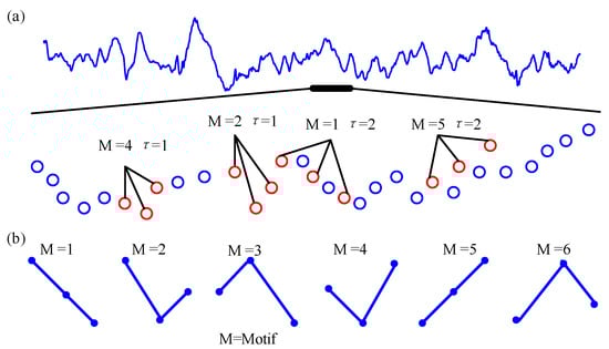 Example of sorting modes. (a) A segment of real EEG signal (upper) and some of the motifs (m = 3, and τ = 1 or 2) (bottom). (b) All of the motifs are of the order of 3 (3!). M represents the motif of the ordinal patterns.