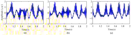 First, multiple sine waves with different frequencies, amplitudes, and phases are added together to generate the simulation data [,]. The low-frequency oscillation (LFO) and high-frequency oscillation (HFO) are denoted by and , respectively. The is a 4–8 Hz theta oscillation and the is a 60–70 Hz gamma oscillation, and the sampling frequency is 1000 Hz. The amplitude of the components was inversely proportional to their frequencies. Both oscillations are normalized to a range of −1 to 1; the purpose is to eliminate the interference caused by amplitude fluctuation and maintain the fluctuation of its instantaneous frequency. The phases were randomly selected from . After that, the Von Mises coupling method is used to generate the amplitude series of HFO []: