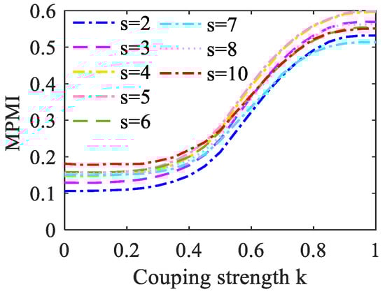 When analyzing the MPE, the coarse-grained process is very important. The specific operation is to truncate the raw time series into several small sequences with the same length and average each segment to obtain a new time series. Therefore, the analysis of signal complexity needs to consider the choice of the scale factor s in the coarse-graining process. The adjacent elements of the original time series contain sequence information. If the value of the scale factor s is too small, the information of the relevant fragments cannot be extracted to the greatest extent, so the analysis effect is not obvious. However, when the complexity difference between the signals is small, the scale factor s should not be selected too large, otherwise, the difference between the signals may be eliminated in the averaging process. In this study, the MPMI value varies with coupling strength under different scale factors s is set. As shown in Figure 6, we can observe that MPMI is proportional to k. When s increases, the MPMI curve moves upward as a whole, but the overall change trend remains unchanged. When k = 0, to avoid a higher MPMI value, s = 3 is selected.