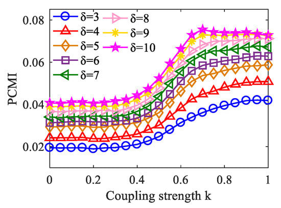 When applying the PCMI method, it is necessary to consider the selection of parameter δ because of its influence on the PCMI estimation. The algorithm itself determines that the value of δ cannot be less than the order m in PCMI []. In the simulation data, we plotted the variation curve of PCMI with the coupling strength k when δ takes from 3 to 10. As shown in Figure 7, we can see that with the increase of δ, the changing trend of the PCMI curve remains constant, and increases with k. However, when δ = 10, k = 0.7 to 1, the PCMI value dropped, causing inaccurate measurement results. That is, when δ takes from 3 to 9, the PCMI estimation is stable. Therefore, in this paper, we suggest that the choice of δ = 5 is an appropriate option.