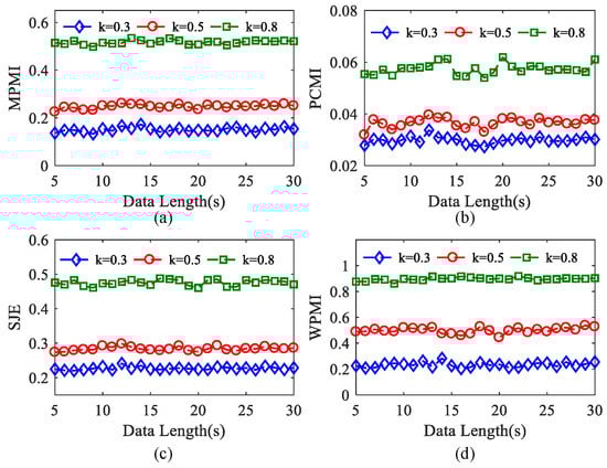 In order to analyze the influence of data length on four kinds of algorithms, simulated time series with data length from 5 s to 30 s (5000 to 30,000 sample points) are generated by using the simulation data. We conducted 100 experiments on each epoch set of data length when k = 0.3, 0.5, 0.8. It can be seen from Figure 8a,c,d that MPMI, SJE, and WPMI all present three small fluctuation horizontal curves, indicating that these three algorithms are not sensitive to changes in the data length. In addition, it can also be explained that when the PAC intensity is constant within a period, the data length has almost no effect on the performance of these three algorithms. When k = 0.8, compared with MPMI and SJE, the WPMI curve is more stable, and the performance is the best. As demonstrated in Figure 8b, when k = 0.3, 0.5, 0.8, the three curves show small fluctuations, which can reflect the PAC strength effectively. In short, these four algorithms can reflect the PAC value under different k within 5 s to 30 s.