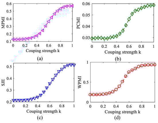 To analyze MPMI, PCMI, SJE, and WPMI characteristics with the changing of coupling strength, coupling coefficient k gradually increased from 0 to 1 with the step of 0.05. Figure 9 plots the relationship between MPMI/PCMI/SJE/WPMI and coupling strength k, where the PAC estimators all gradually increase as the k increases. However, when or , the PAC estimators increased comparatively slowly. It shows that when the coupling is weak or strong, it is difficult to distinguish any difference of PAC intensities.