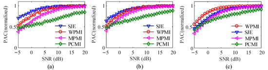 It could be seen that in Figure 10a, when k = 0.3, SNR from −5 dB to 6 dB, compared with the other three methods, SJE method is closer to the coupling value when there is no noise, and the ability to suppress noise better. When the value of SNR ranges from 10 dB to 20 dB, SJE, WPMI and MPMI are all close to the noise-free coupling value, while the PCMI value increases with the increase of the SNR, until SNR = 20 dB, it still does not reach the coupling value under noise-free conditions value. Figure 10b shows that when k = 0.5 and SNR range from is −5 dB to 5 dB, the anti-noise performance of SJE is slightly better than the other three methods. In Figure 10c, when k = 0.8, SNR ranges from −5 dB to 10 dB, WPMI against noise is the best, exceeding SJE. This is because under the same data length, the higher the coupling strength, the better the performance of the WPMI. Moreover, when SNR is from 7 dB to 20 dB, SJE and MPMI have similar performance.