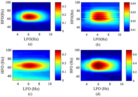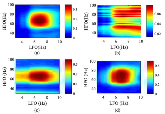 At present, several methods of exploring PAC have been adopted. Among them, the most popular analysis is the comodulogram, in which a “coupling palette” is computed and used to indicate the strength of the modulation of amplitude by phase within wide ranges of phase-giving and amplitude-giving frequencies, [,,]. Its advantage is that the experimenter can directly observe the frequency range showing the phase and amplitude of strong coupling. However, before the analysis, the possible coupling frequency range must be chosen. We used a comodulogram to test whether these four algorithms can detect PAC frequency pairs in a given frequency range. In order to verify the accuracy of the algorithm, the frequency range of the simulation data was expanded to 1–100 Hz, and the actual PAC coupling frequency range was 4–8 Hz and 60–70 Hz. Usually, the abscissa represents the frequencies analyzed as phase-modulating , whereas amplitude-modulated is represented in the ordinate axis; that is, jet colors in a given coordinated (x, y) of the bi-dimensional map indicate that the phase of the x frequency modulates the amplitude of the y frequency.