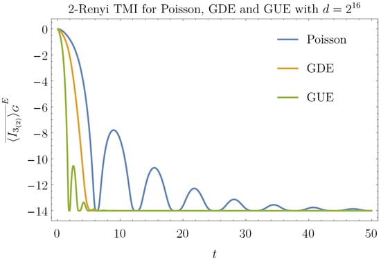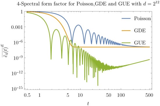 We can now compute over the spectra GUE, GDE and Poisson. We set and and . The time evolution of depends on the spectral form factors. We can see in Figure 3 how the chaotic and integrable behaviors are clearly different. The salient timescales of depend on the timescales of []. The plateau values of Equation (28) are, for large d:
