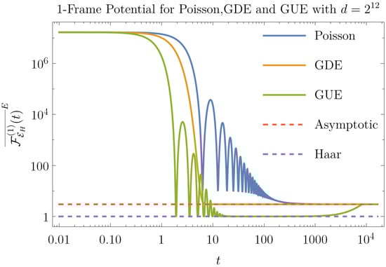 where of course the coefficients do depend on the spectrum of H. We can now take the ensemble average of this quantity. The results are plotted in Figure 2. We can see that the behavior of the Poisson and GDE spectra is quite distinct from that of the GUE. Indeed, for the first two ensembles, the frame potential never goes below the asymptotic value , so it always stays away from the Haar value 1. On the other hand, the frame potential, corresponding to GUE, equals the Haar value 1 in the whole temporal interval .