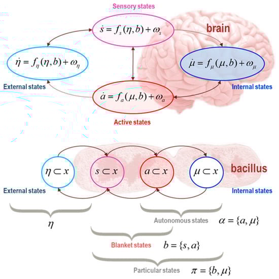 Markov blankets. This schematic (reproduced from []) illustrates the partition of states into internal states (µ, in blue) and hidden or external states (η, in cyan) that are separated by a Markov blanket (b) comprising sensory (s, in magenta) and active states (a, in red). The upper panel shows this partition as it would be applied to action and perception in a brain. Note that the only missing influences are between internal and external states—and directed influences from external (respectively internal) to active (respectively sensory) states. The surviving directed influences are highlighted with dotted connectors. In this setting, the self-organisation of internal states then corresponds to perception, while active states couple internal states back to external states. The lower panel shows the same partition but rearranged so that the internal states are associated with the intracellular states of a Bacillus, where the sensory states become the surface states or cell membrane overlying active states (e.g., the actin filaments of the cytoskeleton). Here, the coupling between sensory and internal—and between active and external states—was suppressed to reveal a simple coupling architecture that leads to a Markov blanket. Autonomous states (α) are those states that are not influenced by external states, while particular states (π) constitute a particle; namely, autonomous and sensory states—or blanket and internal states. The equations of motion in the upper panel underwrite the conditional independencies of the Markov blanket, as described in the main text. By this, we do not mean that these equations of motion define a Markov blanket, or even that they are necessary for a Markov blanket—which can exist in static systems with no dynamics. Instead, these equations represent flows that, under certain assumptions, result in a Markov blanket at steady state. Please see (1) and the associated discussion.