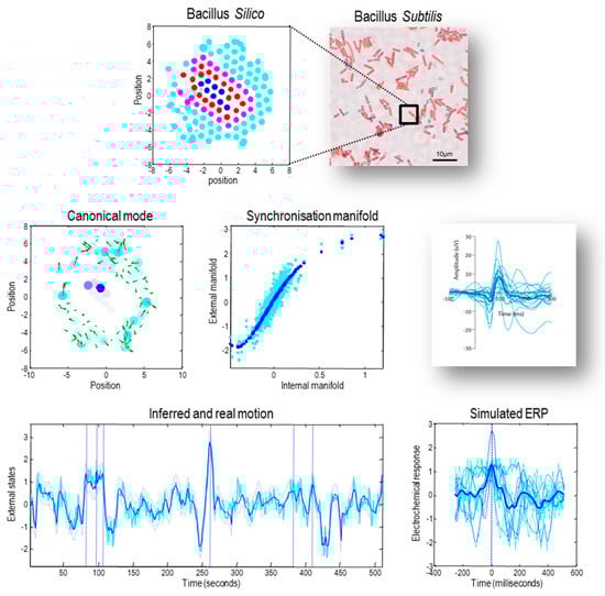 Sentient dynamics and the representation of order. This figure illustrates approximate Bayesian inference that follows when associating the internal states of a system with a variational (i.e., approximate posterior) density over external states. This figure is based upon the simulation of a small rod-like particle used to illustrate different perspectives on self-organisation in [], where the details of this system are specified. In brief, each macromolecule is defined by a set of electrochemical states modelled as stochastic Lorenz attractor. These attractors are coupled between pairs of macromolecules, where the coupling strength depends upon the distance between each pair. In addition, the position and velocity of each macromolecule are described by (stochastic) Newtonian equations of motion subject to forces based upon the difference in electrochemical states between a molecule and its neighbours. The upper panels illustrate a collection of simulated macromolecules, in terms of internal (blue) active (red) sensory (magenta) and external (cyan) states. The middle left panel shows the first canonical vector of motion over the external states (green arrows) that are represented by the internal states (blue dots). The blue and cyan dots are placed at the location of internal and external states, respectively. The colour level reflects the norm (sum of squares) of the first canonical vectors showing the greatest covariation between external and internal states. The middle panel illustrates a synchronisation manifold (conditioned upon the Markov blanket) that maps from the electrochemical states of internal macromolecules to the velocity of external macromolecules. The blue dots identify the manifold per se, while the cyan dots are the estimated expectations used to estimate the manifold (using a fifth-order polynomial regression). The lower panel shows the same information but plotted as a function of time during the last 512 s of the simulation. The conditional expectation is based upon the internal states, while the real motion is shown as a cyan line. The blue shaded areas correspond to 90% confidence intervals. The lower right panel illustrates simulated event-related potentials of the sort illustrated by the insert (lower right panel). The simulated evoked response potential (ERP) was obtained by time locking the internal electrochemical states to the six time points that showed the greatest expression of the first canonical variate (indicated by the vertical lines in the middle panel). The dotted lines are six trajectories around these points in time, while the solid lines correspond to the average. The blue lines are the responses of internal states, while the cyan lines correspond to the real motion associated with the first canonical vector. The timing in the lower panels was arbitrarily rescaled to match empirical peristimulus times—illustrated with an empirical example of event-related potentials in the middle right panel.