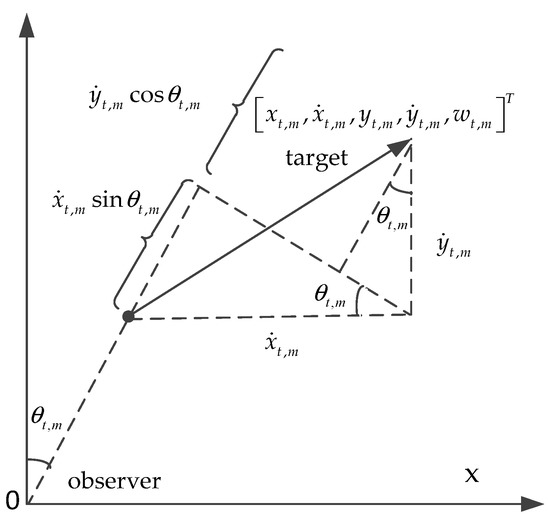 in which is the number of targets in time . At the next time, some existing targets may be disappear, and some fresh targets may enter into the tracking space. For the bearing and Doppler measurements obtained by the passive sensor, is the number of measurements in time . The bearing and Doppler measurements at time are . The purpose of multiple target tracking is to jointly estimate the number of targets in the surveillance volume as well as their states from measurements with noise and clutter.