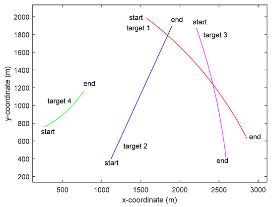 We assume that the number of targets is variable and unknown during the entire tracking procedure in two-dimensional Cartesian space. In this paper, we consider the dynamic nearly constant turn (CT) system model for all the targets with Gaussian process noise [35]. Some maneuvering target tracking problems are discussed in [36,37].
