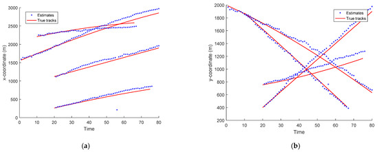 The scans of the targets’ estimated trajectories and true targets’ tracks in x- and y-coordinates versus time for the EKF-based CPHD recursions and PHD recursion are depicted in Figure 4 and Figure 5, respectively. As seen in Figure 4 and Figure 5, the estimated tracks in x- and y-coordinates are similar to the true targets’ tracks for the four targets. This means that the CPHD recursion performed well in tracking multiple targets using the bearing and Doppler measurements. Correspondingly, the PHD algorithm’s tracking accuracy was inferior to that of the CPHD. The calculation time for the EKF-based CPHD for the four targets was 3.46 s per sample run over 80 time scans, implemented in MATLAB R2016a, Intel Core i7 CPU, 16 GB.