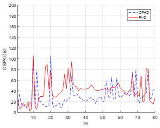 The scans of the average OSPA distance for the four targets versus time for both the EKF-based CPHD recursion and PHD recursion are shown in Figure 6. It appears that the average OSPA distance for the CPHD and the PHD were approximately 30 m and 40 m, respectively. The results also show that the OSPA distance was large when the number of targets was changing, which is normal and means that the CPHD recursion can adapt to changes in targets’ cardinality. It can also be noted that the EKF-based CPHD recursion had a faster reaction to changes in the targets’ cardinality distribution.