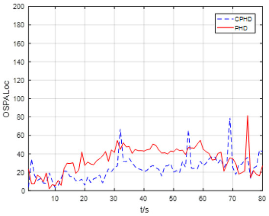 The scans of the average OSPA localization for all four targets versus time for the EKF-based CPHD recursion and PHD recursion are given in Figure 7. In terms of target localization accuracy, Figure 7 shows that the average OSPA localizations for the EKF-based CPHD recursion and PHD recursion were approximately 25 m and 35 m per target, respectively, which demonstrates that the CPHD had a better tracking accuracy performance than the PHD recursion.