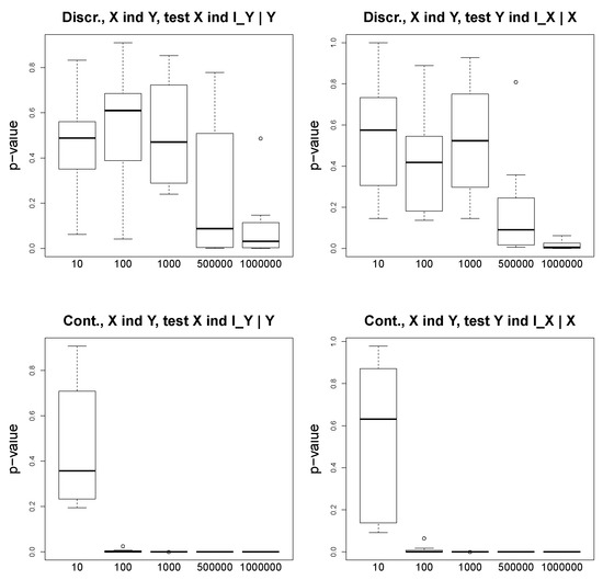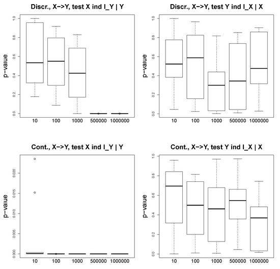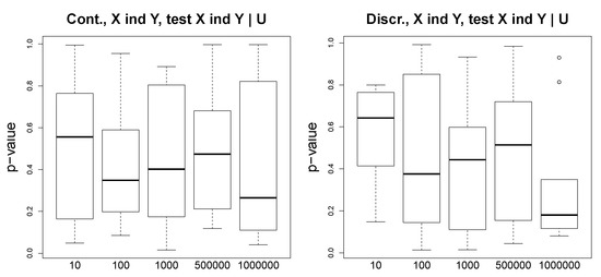 We consider simple discrete and continuous scenarios. In the discrete case, we fix the structures and the probability distributions on the graphs and generate binary variables. In the continuous case, we use a Gaussian distribution. We generate the instrumental variables and , X and Y, and the hidden variable U. We use the bnlearn R package to construct the synthetic datasets, and we also use the conditional independence tests from the same package. For our discrete setting with binary variables, we apply an asymptotic mutual information independence test ci.test(test=’mi’), and for the continuous setting with Gaussian variables, we apply the exact t-test for Pearson’s correlation ci.test(test=’cor’). Note that the abovementioned conditional independence tests from the bnlearn R package return “big” p-values if the variables are conditionally independent, and the p-values are small (with an arbitrary threshold 0.05) for dependent variables.