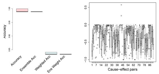 http://webdav.tuebingen.mpg.de/cause-effect (accessed on 15 January 2021), version 1.0. The data set contains 100 pairs from different domains, and the ground truth is provided. The goal is to infer which variable is the cause and which is the effect. The pairs 52–55, 70–71, and 81–83 are excluded from the analysis, since they are multivariate problems. Note that each pair has an associated weight, provided with the data set, since several cause-effect pairs can come from the same scientific problem. In a number of publications reporting results on this dataset, the accuracy is a weighted average. We apply the proposed method, described in