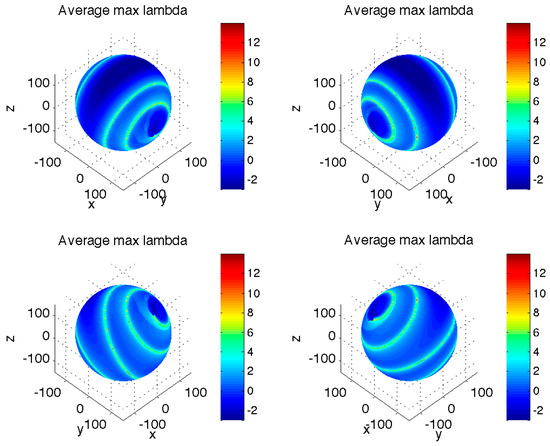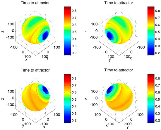 We computed for all points along each transient trajectory between the sphere S and the asymptotic attractor region B and took an average of these values to characterize a given trajectory (Figure 2). Interestingly, a large fraction of initial conditions on the sphere S are characterized by the positive average local stability multipliers obtained, thereby indicating potential sensitivity to initial conditions, which we will indeed confirm in Section 3 below. Furthermore, there is a clear correspondence between the pattern of trajectory-averaged local stability multipliers in Figure 2 and that of the transient duration in Figure 1. In particular, the “blue” regions on the sphere S that initialize the transients with fastest decay toward the asymptotic attractor are also the regions with negative average local stability multipliers, while the “red” ribbon of initial states corresponding to the longest transients is also the region of the maximum positive trajectory-averaged local stability multipliers; using the finite-time Lyapunov exponents [7,8] (by estimating eigenvalues of the strain tensor JTJ, where J is the finite-time Jacobian matrix whose evolution satisfies the tangent linear equations) to tag the trajectories produces essentially identical results (not shown). Thus, the longest transients are naturally associated with trajectories that tend to “travel sideways” along the dynamical slopes of the Lorenz-system “global” landscape, rather than going straight downhill toward the asymptotic attractor.