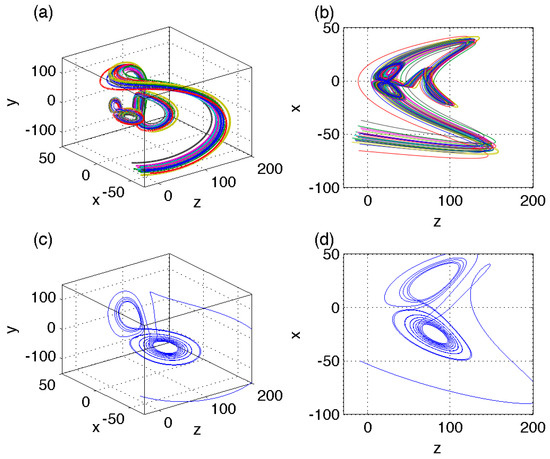results, for this case, in the same system of equations as the original system (1), but for the primed variables. This implies that topological behavior of the trajectories that are somehow able to persist in a far-away-from-attractor region of the phase space in which (3) is valid can be qualitatively described by the asymptotic behavior of the Lorenz system with a different set of parameters rescaled by , where ε corresponds to the ratio of the radius-vector of defining the far-away location of the persistence region to the typical value of the trajectories’ radius-vector in the original Lorenz system. Indeed, the topology of the Lorenz system (1) with parameters rescaled in this way using the value of (Figure 4c,d) looks qualitatively similar to the transient trajectories in Figure 4a,b.