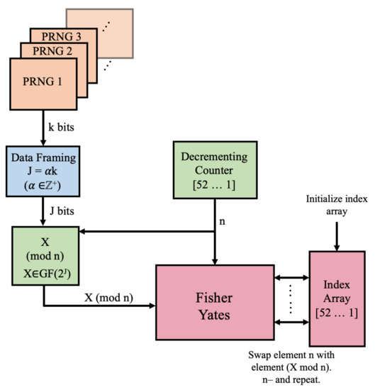 To begin, we introduce a card-shuffling algorithm characterized by modulo arithmetic on RNG outputs and recurrent Fisher–Yates permutations [31]. The system, illustrated in Figure 1, shuffles a standard card deck as an ordered array by repeated Fisher–Yates-based shuffles that utilize random numbers derived from any base-2 RNG.