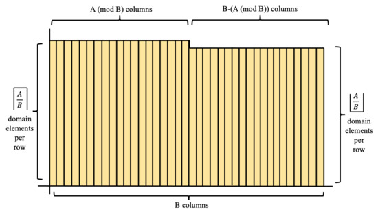 We utilize Equation (1) to measure the entropy of modulo reductions , which can be represented by a surjective map , where and . The mapping process can be visualized as placing the values into bins that represent their residual modulo B, creating a histogram of values as illustrated in Figure 3.