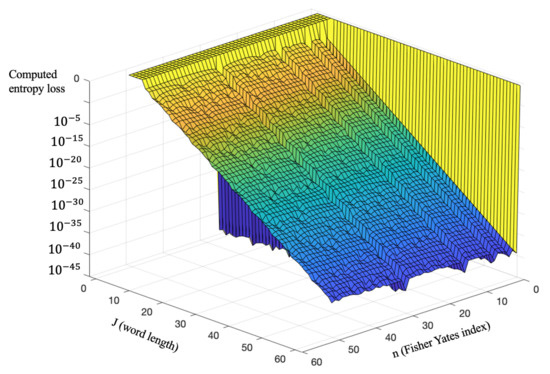 Lastly, nonbinary and mixed-radix number systems are utilized in many scenarios that encompass even simple applications, such as representing metrics such as time and length. Utilizing nonbinary PRNG can help provide uniformity in generating random values for these applications. Utilizing RNS itself is also advantageous in parallel computing and fast arithmetic, which has applications in encryption, nanoelectronics, digital-image processing, and embedded computing. Our claim of Section 3.1 may be used to calculate the entropy loss of many of these mixed-radix and nonbinary applications, especially in games and combinatorial problems, because it is common for the number base to fluctuate throughout these processes. Equation (15), which quantifies the entropy loss of a surjective map , where and for an arbitrary value of J, is important in that it takes into account radix n. Thus, Shannon entropy loss can be calculated for multiple radix values in applications that utilize this mapping process.