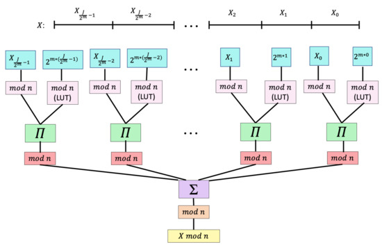 Each power of modulo n can be precalculated and stored in memory to reduce the number of additional calculations. Figure 5 shows how an m-bit processor calculates Equation (23).