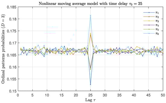 Ordinal patterns probabilities with as a function of the lag for the nonlinear moving average model with feedback strength and intrinsic time-delay . Results obtained for a representative realization of length data are plotted.