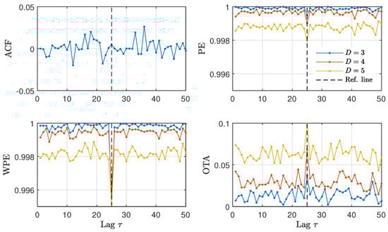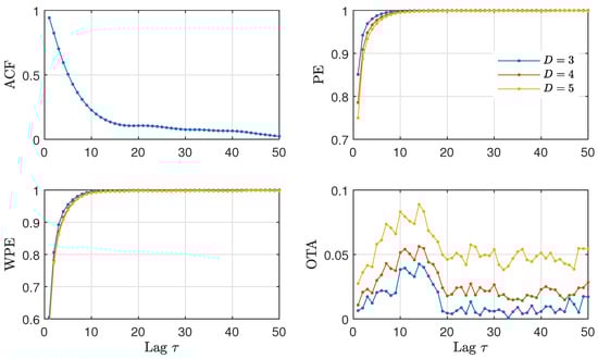 Figure 3 shows the numerical results for the estimation of ACF, PE, WPE and OTA at different values of the lag for time series generated by the nonlinear stochastic model presented in Equation (6), with parameters and . We find that the ACF fluctuates around zero, without any noticeable change in its value when , denoted as a dashed vertical line in Figure 3. In contrast, the ordinal quantifiers show an abrupt change when . Both the PE and the WPE identify the presence of a time-delay in the analyzed time series, showing a downward peak for all orders D. The OTA identifies the presence of a time-delay as well, in this case with an upward peak.