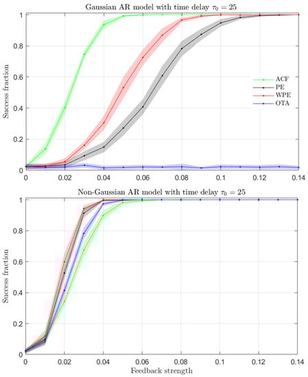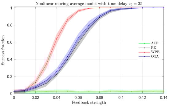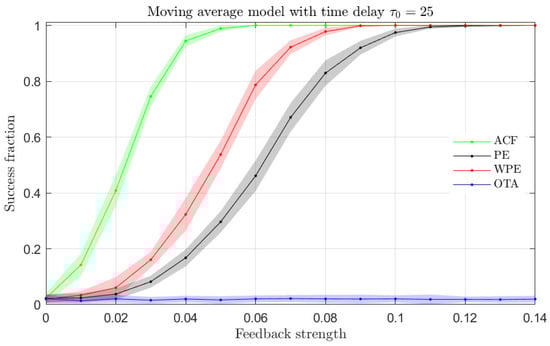 We generate time series from the linear stochastic model described in Equation (7) with and varying feedback strength . Following the procedure introduced above for Figure 4, we now compute the estimation of ACF, PE, WPE and OTA for the numerically generated LMA time series and evaluate the fraction of successful time-delay identifications for all these quantifiers. As shown in Figure 5, we find that the ACF, PE and WPE quantifiers can all successfully identify the presence of a time-delay in the time series.