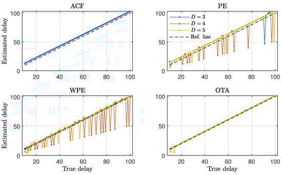 Figure 7 shows that the ACF can properly identify the presence of a time-delay in the generated time series in the range of analyzed delays. However, we find that the ACF systematically overestimates the value of the time-delay, which is evidenced by the offset between the estimated time-delay (blue solid line in Figure 7) and the true time-delay (dashed line in Figure 7). The PE and WPE ordinal quantifiers, as shown in Figure 7, can also identify the presence of the time-delay in the generated time series. These two ordinal quantifiers exhibit a certain tendency to estimate the value of the time-delay at approximately half the true time-delay values for orders . This delay misidentification happens when the value of the quantifier for lags around the sub-multiple of the true time-delay gives a higher contrast than the value of the quantifier for lags around the true time-delay. The presence of delay sub-multiples in the analysis of time series is a known feature of the PE and its variants [17]. In addition, the time-delay values estimated by the PE have an offset with respect to the true time-delays, while the delays estimated by the WPE deviate less from the true time-delays. Finally, the OTA quantifier can properly identify the presence of a time-delay. Values of the time-delay estimated by the OTA deviate little from the true time-delay values, as indicated by the overlap between the solid (estimated delay) and the dashed (true delay) lines in Figure 7.