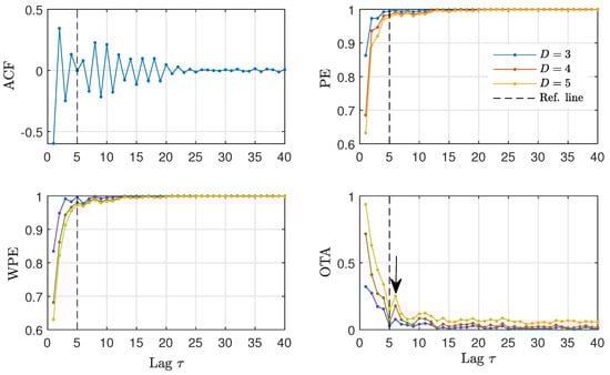 The identification of time-delays from time series becomes more intricate when the values of the time-delay are in the vicinity of other temporal scales present in the generating models [47]. For this reason, we proceed to analyze time series from the time-delayed Hénon map with intrinsic time-delay . As shown in Figure 8, the ACF, WPE and PE quantifiers hardly identify the presence of a time-delay, indicated by the dashed vertical line in this figure. The OTA quantifier is the only one that has a clear change for lags around the true time-delay, indicated by the arrow in Figure 8.