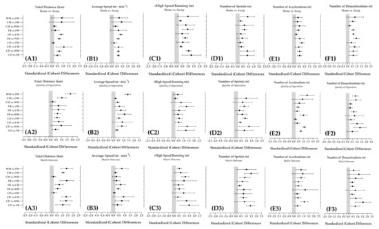 The effects of contextual factors on match running performance according to playing positions were reported using standardized (Cohen) differences, following the match location (A1–F1), quality of opposition (A2–F2) and the match outcome (A3–F3). Trivial area was calculated from the smallest worthwhile change determined as 0.2 times the between-playing positions. Abbreviations: CD—central defenders; CM—central midfielders; DEC—decelerations; FB—fullbacks; FW—forwards; Km—kilometers; m—meters; m · min−1—meters per minute; n—number; WM—wide midfielders.