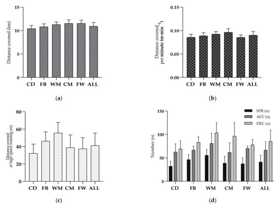 Regarding the performed acceleration profiles, our study reported a higher ACC in the WM players than CD and CM (small effect). Additionally, WM players presented higher DEC than other playing positions (moderate to large effect). Our results were not consistent with the literature, which documents positional differences in the acceleration profiles during competitive matches [,,]. The players in lateral positions accelerated more than central positions []. Our findings had substantially less ACC and DEC than previously reported findings in higher-ranked leagues [,,,]. On the other hand, the average number of maximal accelerations per match and peak acceleration achieved during the match-play does not seem to be influenced by positional roles []. However, these studies generally use different acceleration thresholds that could bias the ACC and DEC outputs upon the time-dependent and transient reductions []. Ideally, future studies should also consider the ACC and DEC through each half of the match. Normally, the players performed lower numbers of ACC and DEC in the second half than the first half [,,,].
