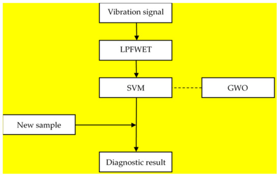The fault diagnosis method for combined fault of wind turbines we proposed can be described as follows. First, extract features from vibration signals by low pass filtering empirical wavelet transform (LPFEWT). Then, build features datasets in different conditions (normal, single faults and combined fault). Last, train the support vector machine (SVM) for classification, using grey wolf optimizer (GWO) for hyperparameter tuning. After training, the obtained SVM model can identify faults of wind turbines by inputting features of vibration signals. The flow chart of the method is shown in Figure 1.