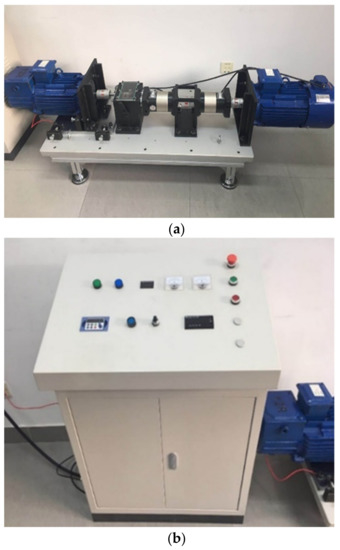 The laboratory’s wind turbine drivetrain fault test rig is shown in Figure 3, which consists of a control panel cabinet and an experimental test bench to simulate doubly-fed induction generator (DFIG) wind turbine shaft misalignment (between the gearbox and the generator) and broken gear tooth faulty conditions. In Figure 3a, the speed of the motor of the experimental test bench on the right side is decelerated by a planetary gear reducer to simulate the wind blowing blade speed, then it is accelerated by a planetary gear accelerator and a gearbox to drive the generator. The maximum speed of the driving motor is 720 r/min, the speed of the generator is 500 r/min. The left gearbox can be adjusted by the handle to select a normal gear or a broken gear. The generator can be adjusted by the support to create offset or angular misalignment. The control panel cabinet shown in Figure 3b can set and display the motor speed, showing the angle between the generator and the gearbox and other electrical parameters.