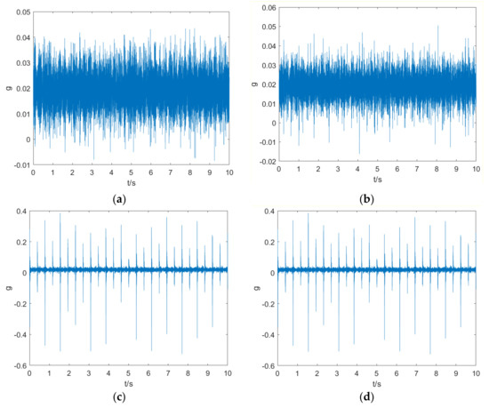Samples of vibration signals in different conditions: (a) normal; (b) misalignment; (c) broken tooth; (d) combined fault.