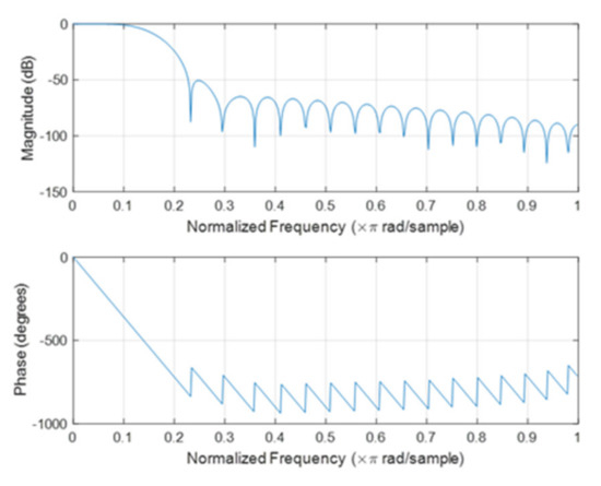 The magnitude and phase responses of the designed FIR low-pass filter.