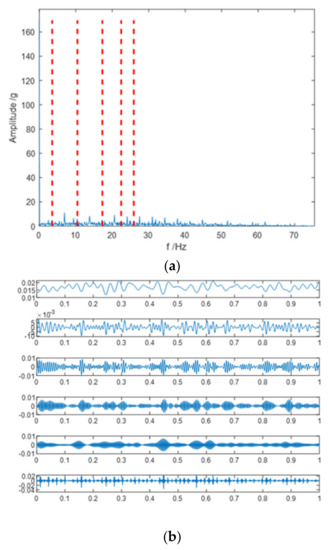 The EWT decomposition results of a combined fault signal: (a) Fourier spectrum segmentation; (b) empirical mode components.