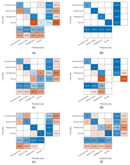 Confusion matrix charts of fault diagnosis results with features obtained by different approaches: (a) EWT; (b) LPFEWT; (c) EMD high frequency components; (d) LPFEMD high frequency components; (e) EMD low frequency components; (f) LPFEMD low frequency components.