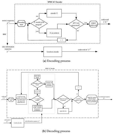 A forbidden symbol is considered during the encoding process of SPDCAC. The encoder of SPDCAC reserves a sub-interval that does not correspond to any valid source symbol in the encoding probability distribution intervals. This interval is related to a forbidden symbol that is not encoded. If there is no error in the codeword, the forbidden symbol should not be decoded during the decoding process. Otherwise, if the decoder finds that the codeword falls into the forbidden interval, it can be determined that the codeword is incorrect. Adding ‘forbidden symbols’ in the coding process will only increase the size of the alphabet, which will not break the internal correlation among the symbols in the source sequence. This approach can rapidly detect whether the codeword is wrong so that the decoder can terminate the corresponding branch in the decoding tree immediately to improve decoding performance.