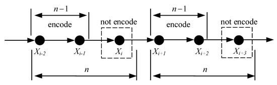 The encoder of SPDCAC only encodes a part of the symbols in the source sequence through the arithmetic encoder based on the context model. Other ‘purged’ symbols in the source sequence are not encoded and are only used as the context conditions for the coding of subsequent symbols. Figure 2 shows an example of the SPDCAC encoding process. The first symbols in every n source symbols need to be encoded, and the remaining ‘purged’ symbol together with those encoded symbols are used as the context conditions for the coding of following symbols (it can be regarded that the purging rate is ). We use to represent the codeword output by the SPDCAC encoder after encoding . Since the underlying encoder of SPDCAC is an arithmetic encoder, as the encoding continues, bits are constantly added to the codeword, and the length of the codeword will continue to increase. It should be noted that if the encoder encodes the source symbol at moment i, but does not encode the source symbol at moment , then the codeword is the same as the codeword . When the encoder completes the encoding of the entire sequence, it outputs the codeword .