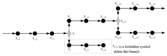 - If the symbol that needs to be decoded at the current position i is a symbol that is not encoded at the encoder, the decoder needs to assume two possible results at this position: 0 and 1. In this way, a new decoding branch is added to the decoding tree. Then, the posterior probabilities and of the two hypothetical symbols are calculated. Similarly, the cumulative product of posterior probabilities and of the two decoding branches are also calculated. Both decoding branches will continue to extend one step forward.
