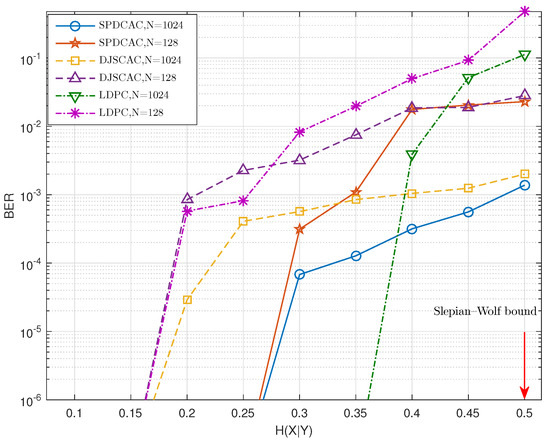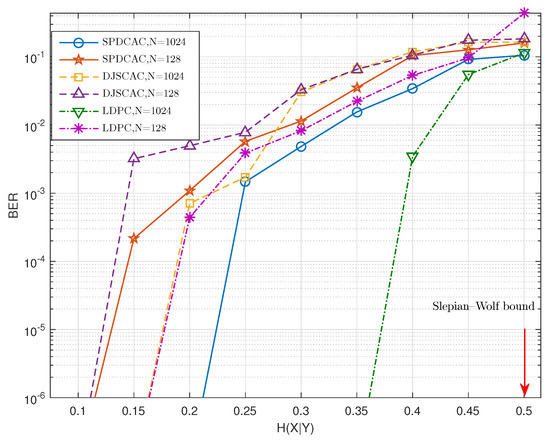 Figure 8 shows the decoding performance of different schemes when coding the same source at different code rates. It can be seen that in some code rate cases, SPDCAC can exhibits a better BER performance than that of DJSCAC. Compared with the DSC scheme based on the LDPC code, SPDCAC exhibits a better BER performance when is larger, and this advantage is more significant when the code rate is lower.