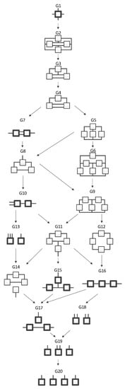 G1 is the most complex general graph, in which the variables are connected in a tetradic relation. Graphs below G1 reflect increasingly less complex decompositions of G1, ending with G20 which has complete independence among the variables. Arrows from one general graph to another represent hierarchy such that going from the parent graph (the source of the arrow) to the child graph (the terminus of the arrow) results from deleting one relation from the parent graph.
