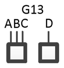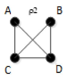 RA graphs can include pairwise and non-pairwise relations. For example, graph G15 has four lines (variables) and three boxes (relations). One line connects to all three boxes, meaning one variable is included in all three relations, and separately a single line representing one of the other three variables extends from each box. Because only two lines extend from any given box, all relations in G15 are pairwise (dyadic). Figure 2 shows G15 with labels (A, B, C, D) added for the variables, yielding a specific structure having dyadic relations AD, BD, and CD. In RA notation, this graph is AD:BD:CD, the colon represents independence among relations. The notation AD:BD:CD encodes the independencies . The example in Figure 2 represents one of four specific graphs for the general graph G15, the other possible permutations are AB:AC:AD, BA:BC:BD, CA:CB:CD. These permutations have the same general independence structure (. ⊥.., … | ….), (… ⊥ … | ….), but given data, produce different conditional probability distributions.