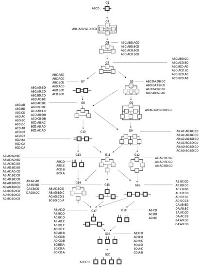 A merger of the conventional directed system lattice with the additional predictive graphs of Figure 6 gives the augmented directed system lattice in Figure 7. The specific graphs from G2′ and G3′ from Figure 6 are members of general graphs G3 and G7, respectively. Three general graphs are added to the augmented lattice, namely G10, G15 and G17; these are G4′, G5′, and G8′ from Figure 6, the naïve Bayes or naïve Bayes-like equivalent RA general graphs. All of the specific structures that are added to the augmented lattice are denoted in bold letters in Figure 7. G13 is the independence model for the conventional directed system graphs. The augmented lattice also includes G20 A:B:C:D, which is the natural independence model for the additional predictive graphs that do not include the IV term (ABC). Including these additional predictive graphs in the directed system lattice increases the number of predictive general graphs from nine in the conventional directed system lattice to 12 in the augmented lattice and 19 specific graphs in the conventional lattice to 31 in the augmented lattice.