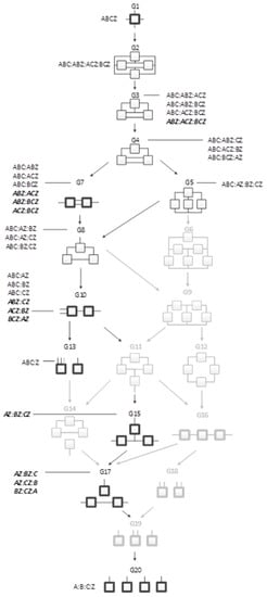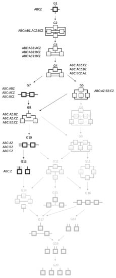 In the neutral system lattice of Figure 1, any of the variables can be part of any relation. In contrast, in the standard directed system lattice, by convention, all of the IVs are always included in one of the relations (the “IV relation”); the other relations in the model include predictive IV-DV interactions (or the DV alone if there are no such interactions). In this paper, the DV in directed system specific graphs is called “Z” and the IVs are called A, B, C, and so on. For example, the first specific graph listed under G3 from Figure 5, ABC:ABZ:ACZ, has all three IVs in the first relation, followed by two IV-DV relations. Aside from allowing for the presence of relations among the IVs (without specifying any such relations), the model says that there is a relation in which A and B might predict Z and another relation in which A and C might predict Z; the net predictive relation between A, B, C and Z is a maximum entropy fusion of these two predictive relations.