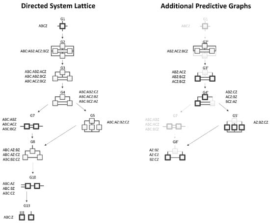Figure 6 augments the conventional directed system lattice (on the left) of Figure 5 with a lattice of additional predictive graphs (on the right). These additional graphs offer unique analytical results, but that are not typically included when searching the hierarchically restricted directed system lattice.