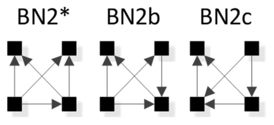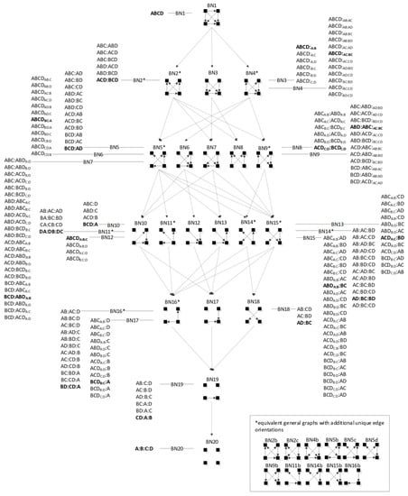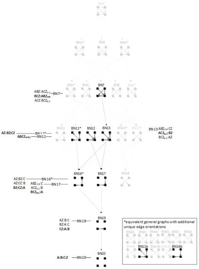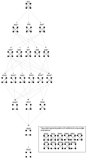 In Figure 8, general graphs are labeled BN1, BN2…BN19, BN20. Solid squares represent variables; edges are represented by directed arrows from one square to another, representing a parent–child dependency relationship. The dashed lines with arrows from one general graph to another represent the hierarchy of general graphs, with parent graphs being above child graphs. Child graphs result from the deletion of one edge from the parent graph. The insert on the bottom right indicates structures that are topologically different from graphs in the lattice marked with asterisks but have identical independence structures to these marked graphs and thus are Markov equivalent (the topological difference cannot be removed by any labeling of the variables). For example, BN2b and BN2c in the insert are topologically different but have the same independence structure as BN2* in the lattice. These additional representations are discussed below in Section 3.2.2.