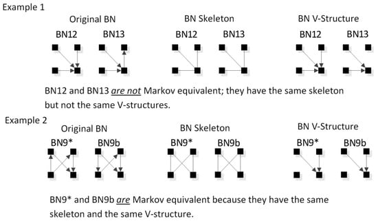 Two Bayesian Networks are Markov equivalent if and only if they have the same skeleton and the same V-structure [28], resulting in the same underlying independence structure. The skeleton of a graph is its undirected representation. As already defined, a V-structure occurs when two or more directed edges that are not themselves directly connected by an edge converge on a single node. Figure 9 shows an example of Markov non-equivalent (Example 1) and equivalent (Example 2) BN general graphs.