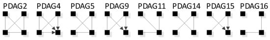 A BN general graph is represented in the literature by an unlabeled PDAG [29], also known as a Maximally Oriented Graphs [30], Essential Graph [31] and equivalence classes of directed acyclic graphs [32]. In a PDAG, edges can be directed, undirected or a mix of directed and undirected. A PDAG includes edge direction when a V-structure is present and removes edge direction when no V-structure is present. If there are no V-structures in a given BN, all edges are undirected in its PDAG representation. Figure 11 shows the PDAG representation of the graphs shown in the insert at the bottom of Figure 8. (PDAG2 encompasses BN2b and BN2c, etc.) Undirected edges can have either direction as long as a cycle is not created and also a V-structure is not created that is represented by another BN general graph. For example PDAG16, labeling variables A, B, C, D in order of left to right, top to bottom could be oriented as B←D→C (BN16*) or B→D→C (BN16b) (or its mirror image) but could not be oriented as B→D←C, because that creates a V-structure resulting in a different independence structure represented separately by BN17.